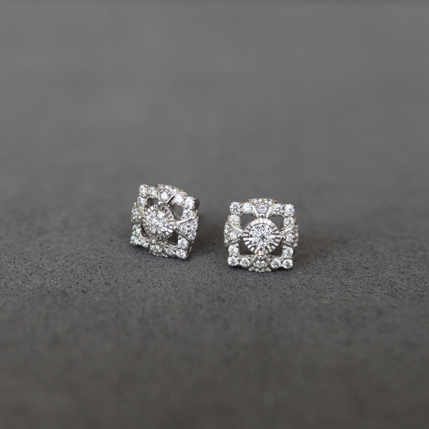A Delicate Sterling Silver Square Design. 1/2Ct TW Diamond Square Cluster Fashion Stud Earring in Sterling Silver