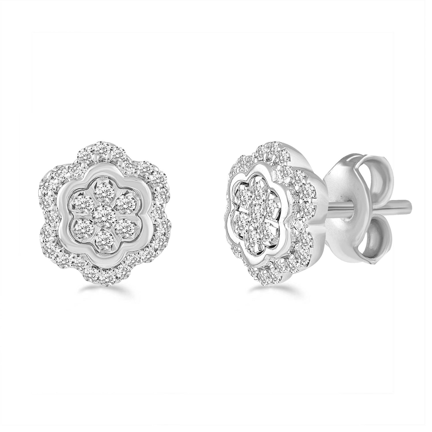 These charming Sterling Silver stud earrings feature a Floral Cluster design with round Natural diamonds in the center totaling 1/2 CARAT total weight. Designed with a Push Back(AKA Friction Back) mechanism for secure and comfy fit. The perfect style & workmanship make these earrings a true masterpiece.