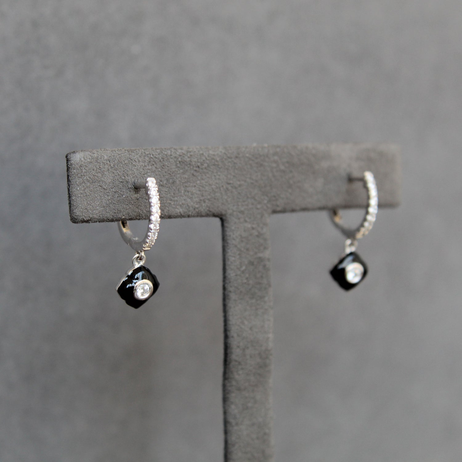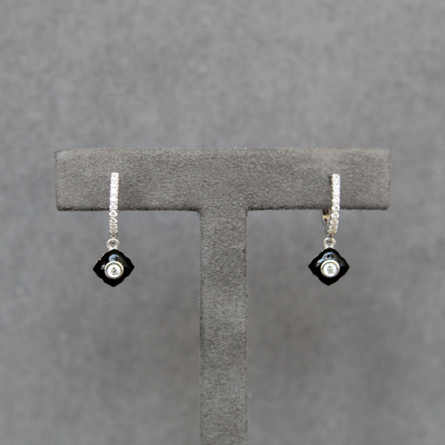 1/4 Ctw Natural Diamonds Black Enamel Art Deco Flower Dangle Drop Hoop Earrings in 925 Sterling Silver